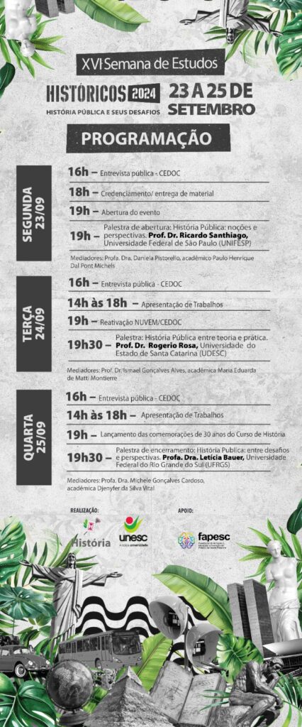 Na próxima semana, o curso de História da Unesc inicia sua 16ª Semana de Estudos, que tem como tema “História pública e seus desafios”. Em dois dias, os participantes entrarão em contato com apresentações de trabalhos inscritos e palestras de convidados.